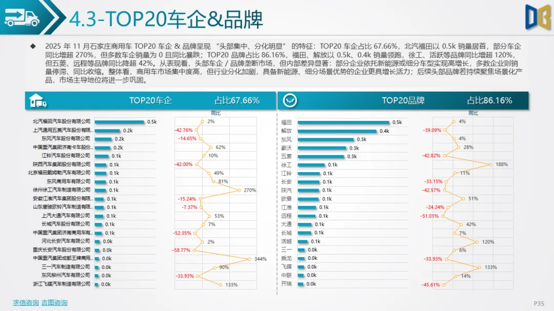 TOP20 车企与品牌分别占据 67.66% 和 86.16% 的市场份额,北汽福田、解放等头部企业以 0.5k、0.4k 销量领跑,徐工、活跃等品牌同比增幅超 120%,而五菱、远程等品牌同比降超 42%。这种分化背后,是企业对新能源转型与场景化产品布局的差异,具备新能源技术与细分场景优势的企业更具增长活力,契合全国商用车行业从 “量之战” 转向 “价值之争” 的竞争逻辑。