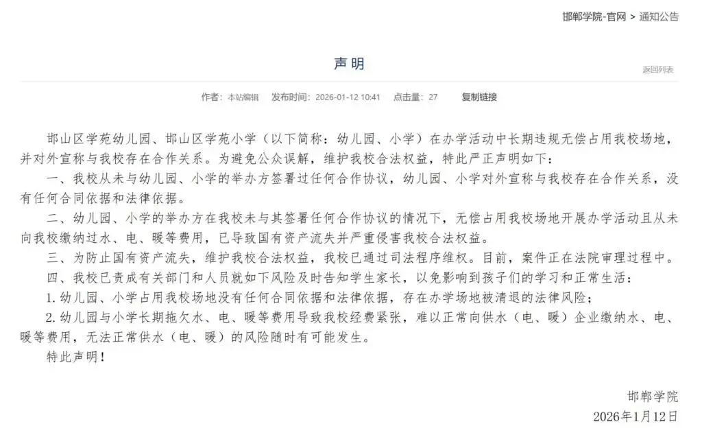 1月12日,邯郸学院公开发布声明,称民办的邯山区学苑幼儿园、邯山区学苑小学违规占用场地且拖欠水、电、暖费用。