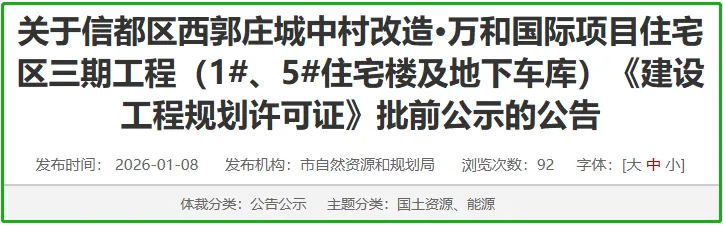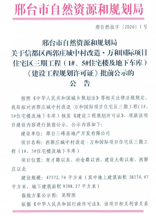 按照《中华人民共和国城乡规划法》等相关法律法规规定,我局拟对西郭庄城中村改造·万和国际项目住宅区三期工程(1#、5#住宅楼及地下车库)核发《建设工程规划许可证》,现就项目建设内容进行批前公示。