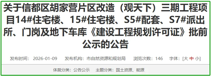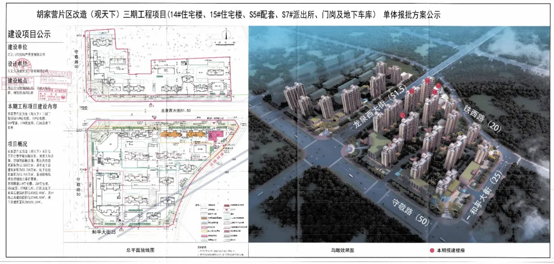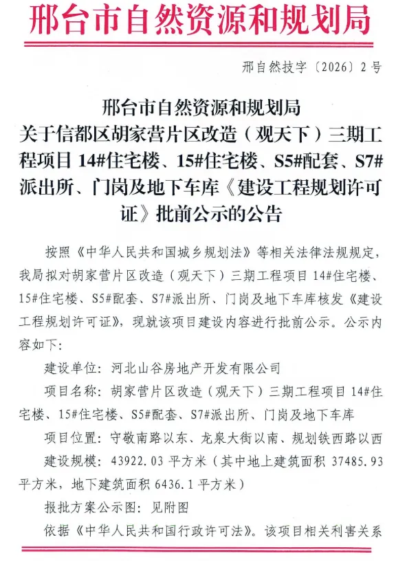 按照《中华人民共和国城乡规划法》等相关法律法规规定,我局拟对胡家营片区改造(观天下)三期工程项目14#住宅楼、15#住宅楼、S5#配套、S7#派出所、门岗及地下车库核发《建设工程规划许可证》,现就项目建设内容进行批前公示。