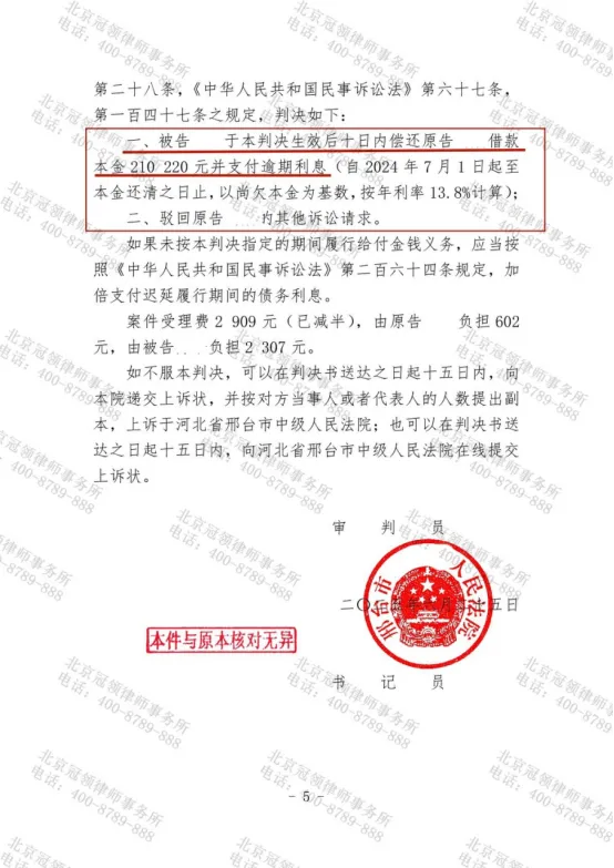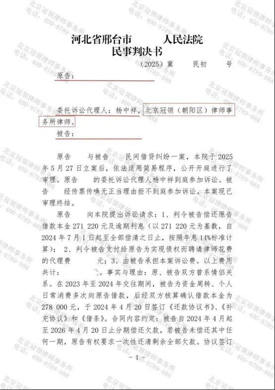 2025年6月,河北省邢台市某区人民法院对一起民间借贷纠纷案作出缺席判决,冠领律师通过梳理借贷证据,在被告拒不到庭的情况下系统举证,维护了委托人的合法权益,获得法院判决支持原告宁如心的大部分诉讼请求,判令被告孙奇偿还借款本金210220元及相应利息。