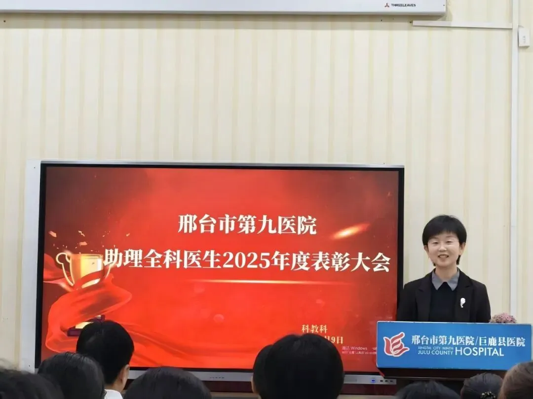 近日,邢台市第九医院组织召开“2025年度助理全科医生年度考核暨优秀学员表彰大会”,邢台市第九医院副院长李亚梅出席会议,助培带教师资(含基层实践基地)及两届助培学员共计 100 余人参加会议。会议由科教科科长王伟佳主持。