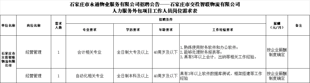 石家庄市永通物业服务有限公司是石家庄市交投智联物流有限公司人力服务外包业务承接单位,现面向社会公开招聘外包人员,具体招聘事宜公告如下: