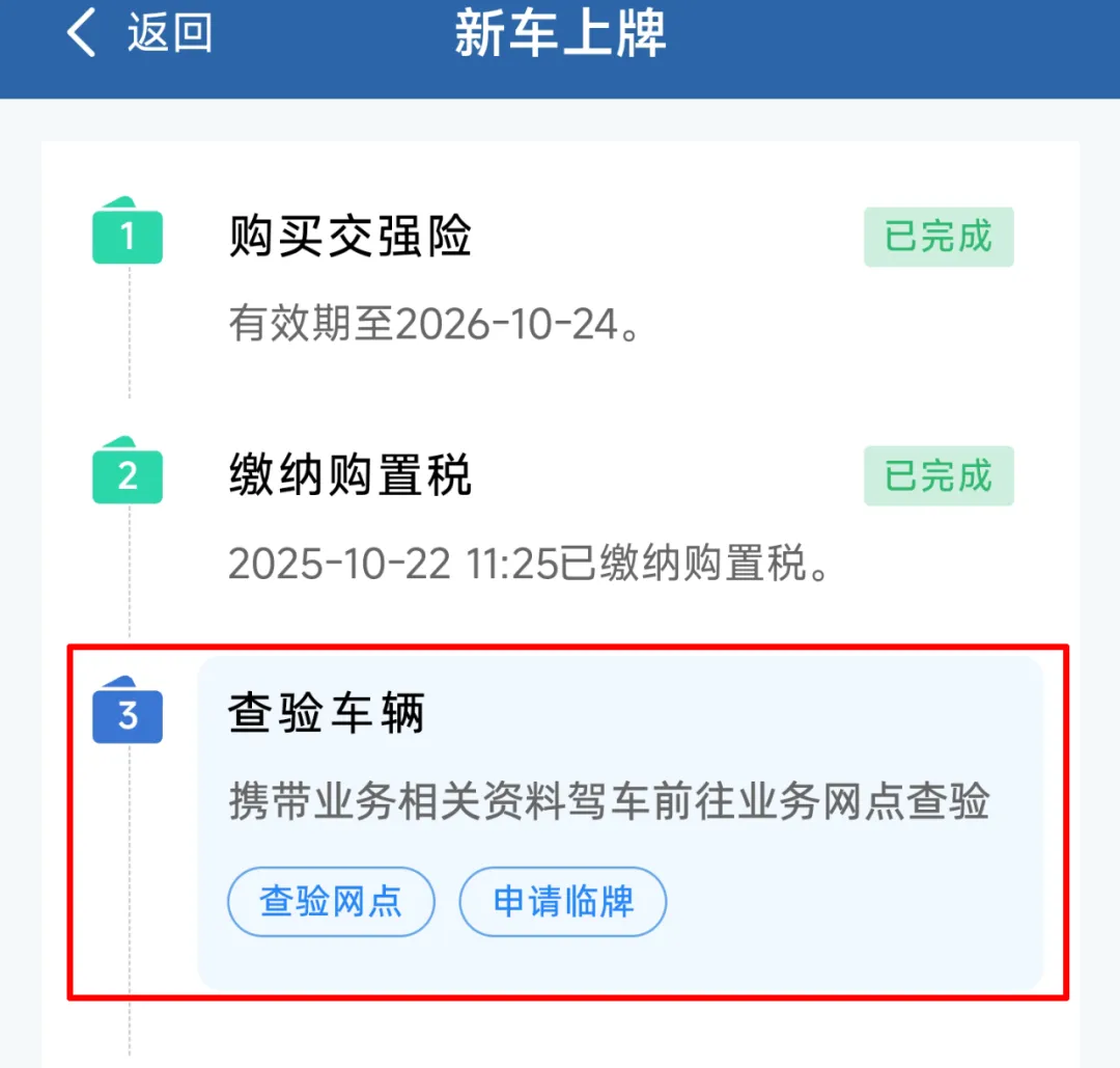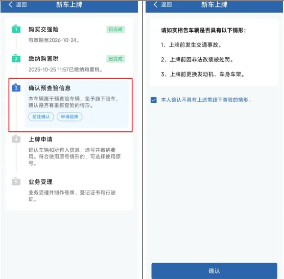 ④再次核对您的车辆和所有人信息,填写有误的,点击“重新修改”;确认无误的,点击“确认信息”;