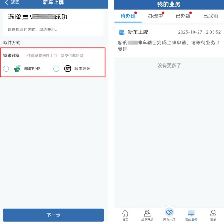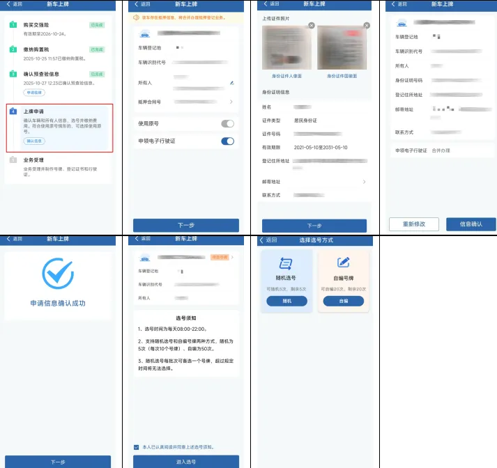 ①确认车辆和所有人信息,符合使用原号情形的,可选择使用原号,存在抵押联网信息的,将合并办理抵押登记。确认无误后,点击“下一步”;②上传本人身份证件照片(人像页、国徽页),确认身份证明信息,选择邮寄地址后,点击“下一步”;