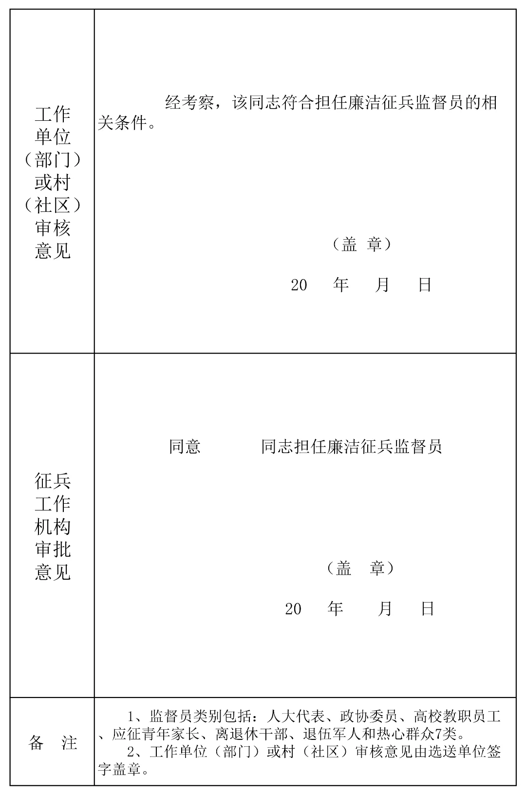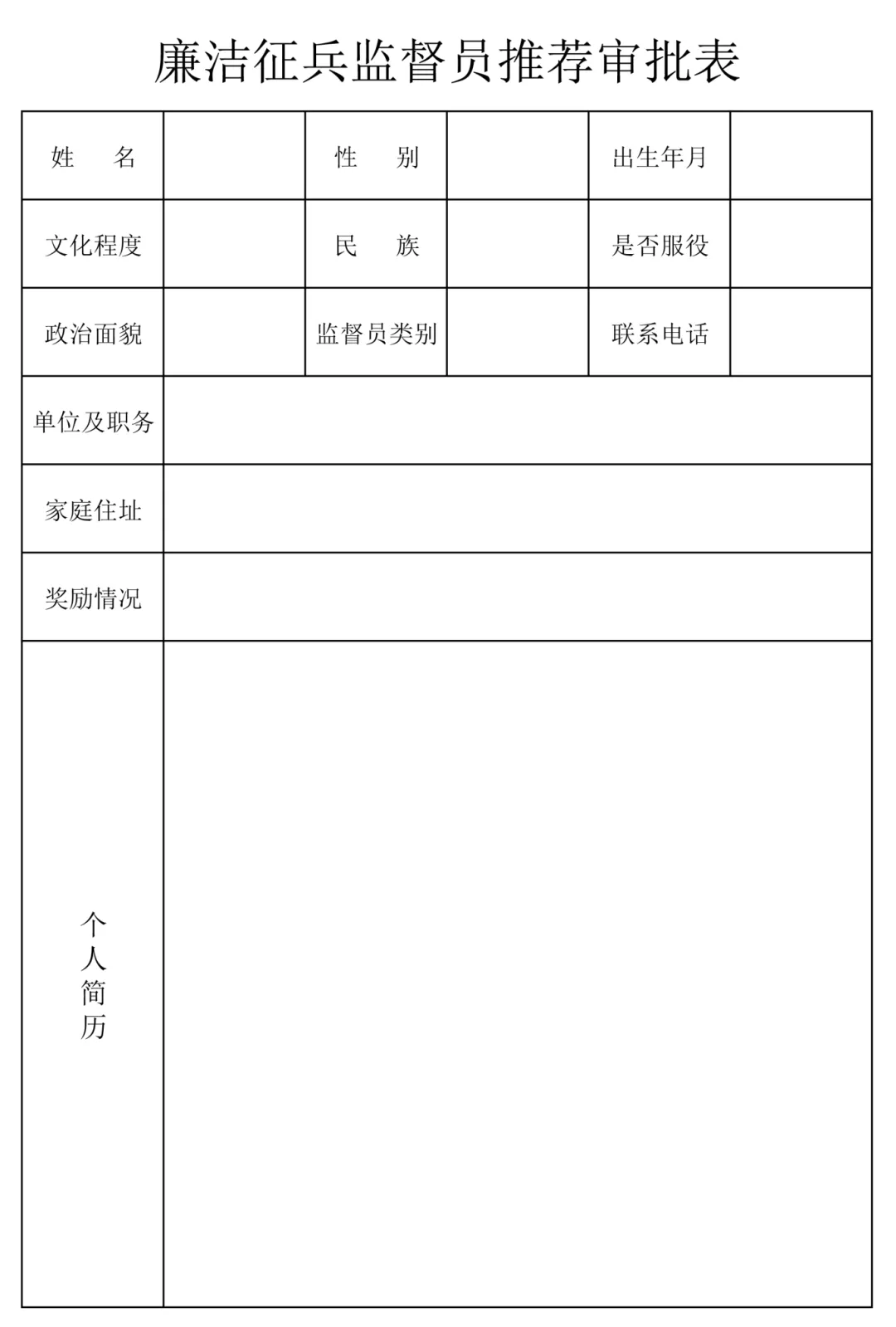 (二)报名资料。有意者请于1月31日下午18时前将廉洁征兵监督员个人申请表、廉洁征兵监督员推荐审批表和身份证复印件送至磁县人民政府征兵办公室。
