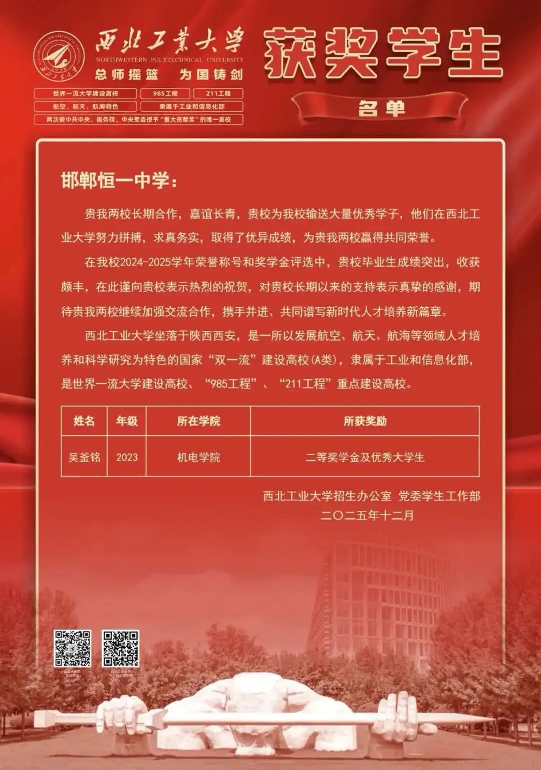 新年新喜,捷报传来。西北工业大学向我校发来喜报,祝贺我校优秀毕业生在大学期间表现优异。
