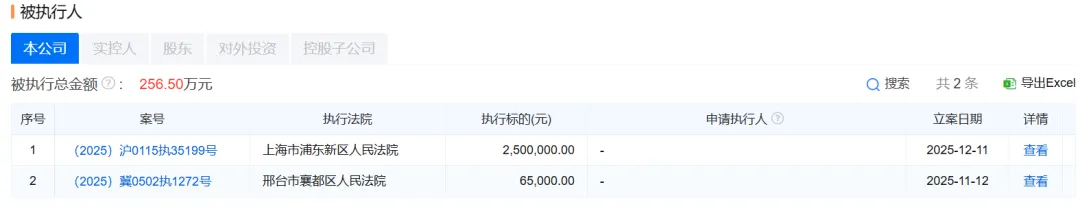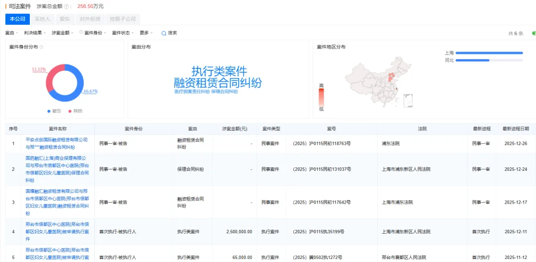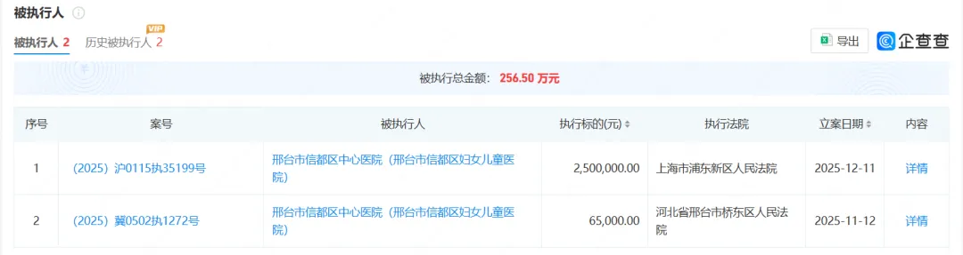 截至目前,邢台市信都区中心医院现存2条被执行人记录,分别为:2025年12月11日,邢台市信都区中心医院被上海市浦东新区人民法院立案执行,执行标的250万元,案号为(2025)沪0115执35199号。2025年11月12日,邢台市信都区中心医院被邢台市襄都区人民法院列入被执行人名单,执行标的6.50万元,案号为(2025)冀0502执1272号。