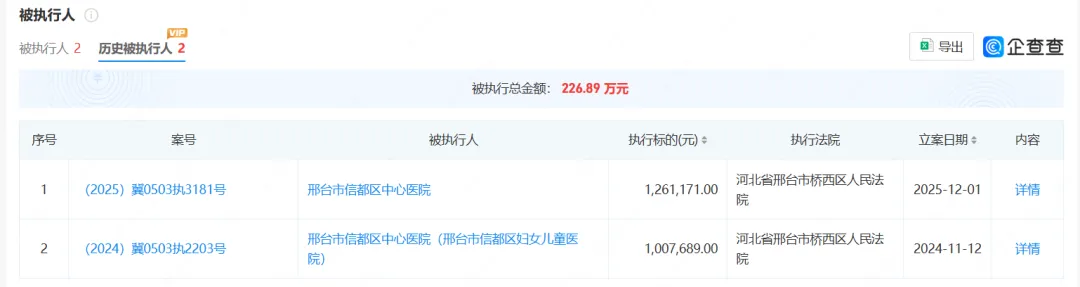 日前,据企业预警通提供的信息显示,邢台市信都区中心医院近期两次被法院列入被执行人,被执行总金额256.50 万元。企查查显示,该公司还存在两条历史被执行人信息,被执行总金额226.89 万元。