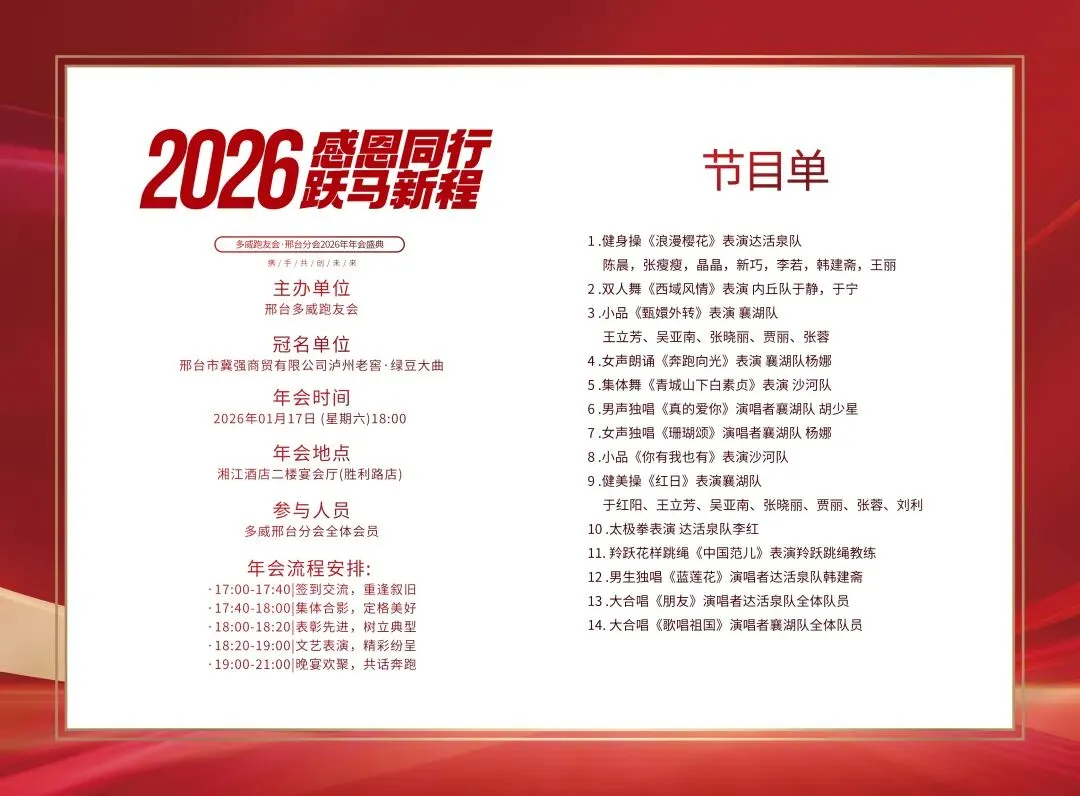 各位跑友:本次跑友会年会报名通道正式截止,感谢大家的积极参与和热情支持!报名成功的跑友请留意后续年会具体行程、场地及相关须知通知,我们将用心筹备,与大家共度一场属于跑团的暖心盛会。未及时报名的跑友也无需遗憾,后续跑团还将推出各类线下活动,期待与你并肩奔跑、相聚同行!邢台多威跑友会