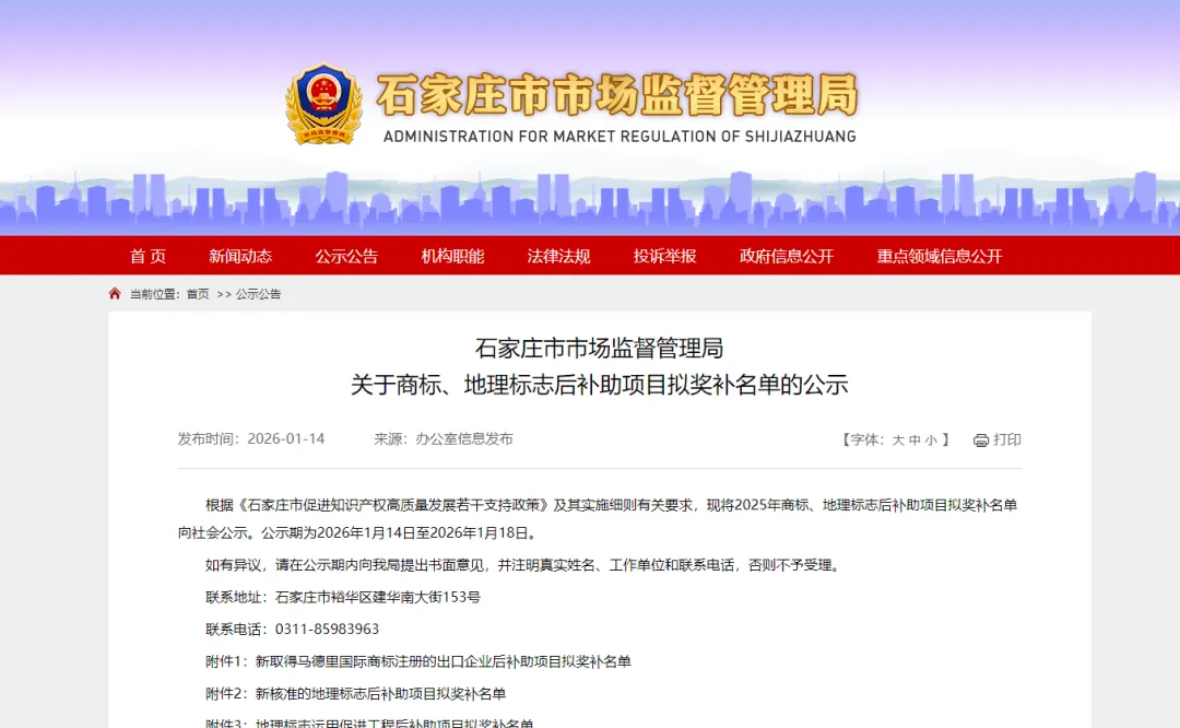 关于商标、地理标志后补助项目拟奖补名单的公示根据《石家庄市促进知识产权高质量发展若干支持政策》及其实施细则有关要求,现将2025年商标、地理标志后补助项目拟奖补名单向社会公示。公示期为2026年1月14日至2026年1月18日。