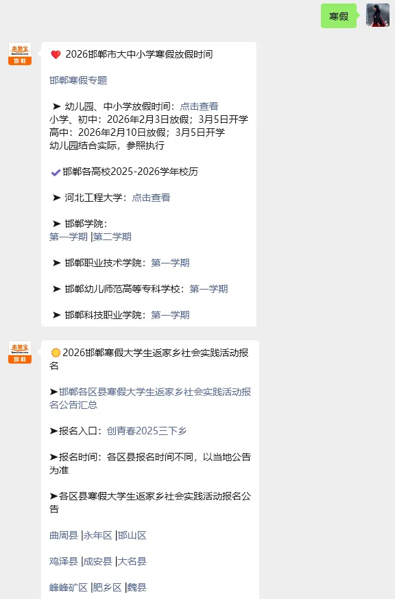 小编提示:也可以关注【邯郸本地宝】,对话框搜索【寒假】可获得邯郸2026大中小学放假时间、邯郸大学生返家乡社会实践活动报名等相关信息。