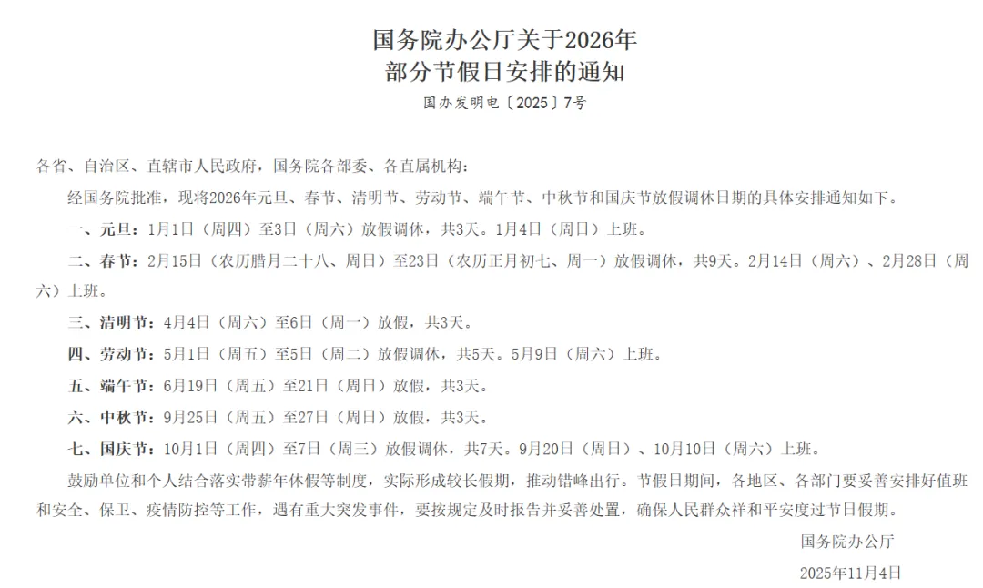 2026年元旦、春节、清明节、劳动节、端午节、中秋节和国庆节放假调休日期的具体安排如下