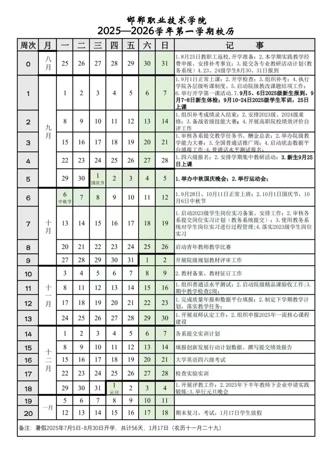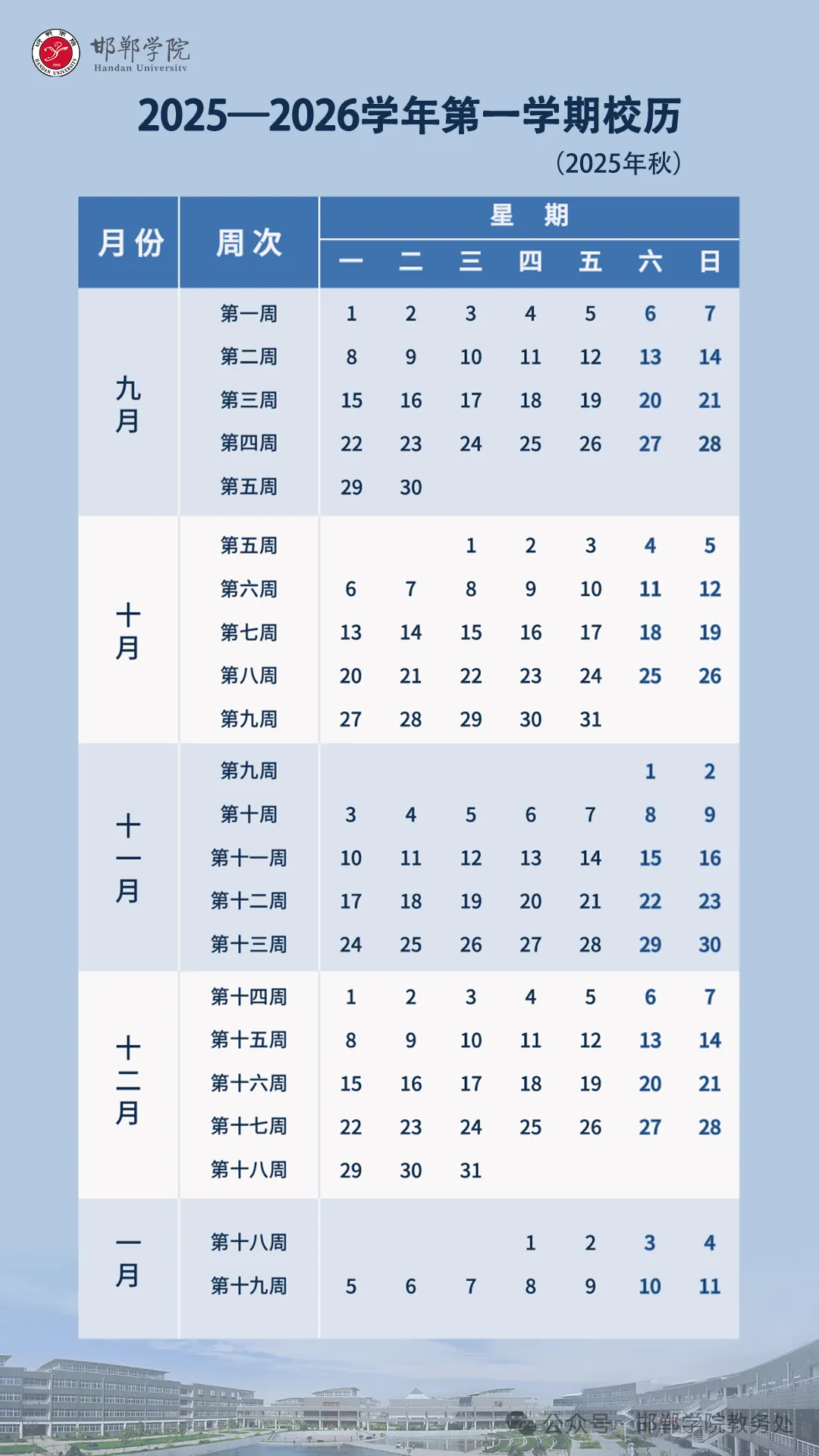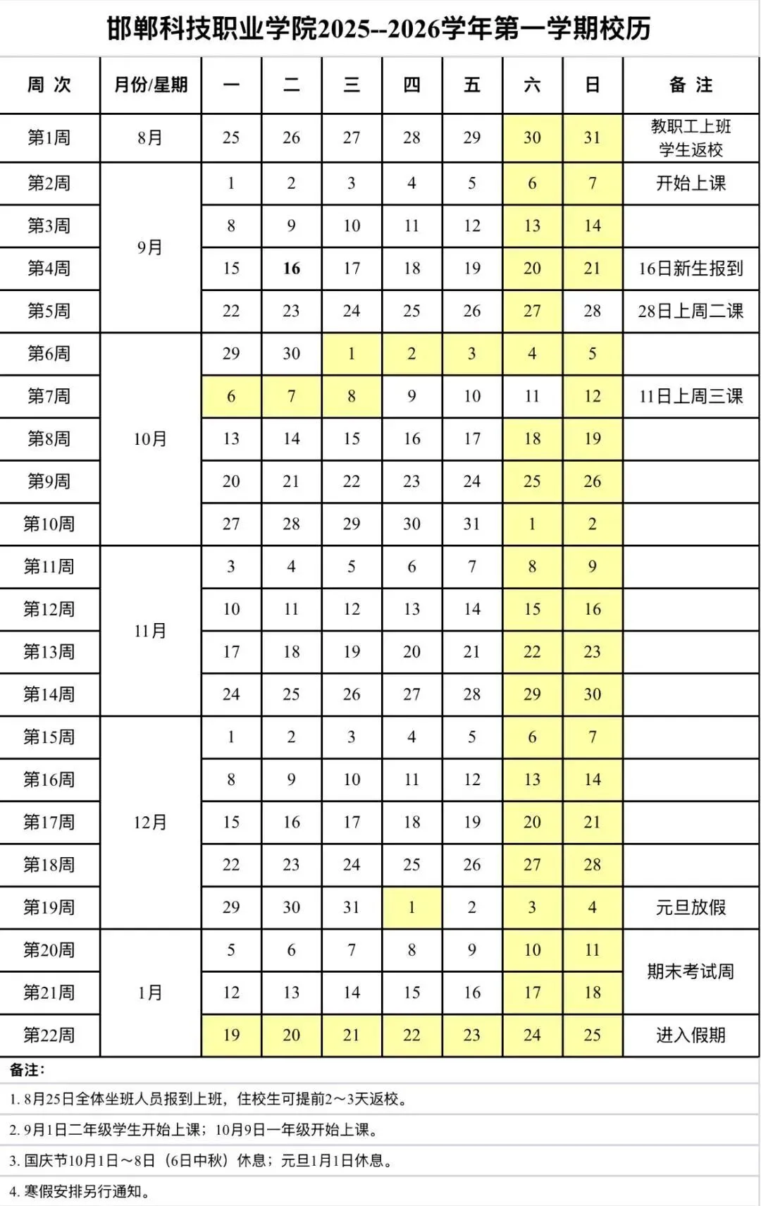 邯郸职业技术学院2025-2026第一学期校历