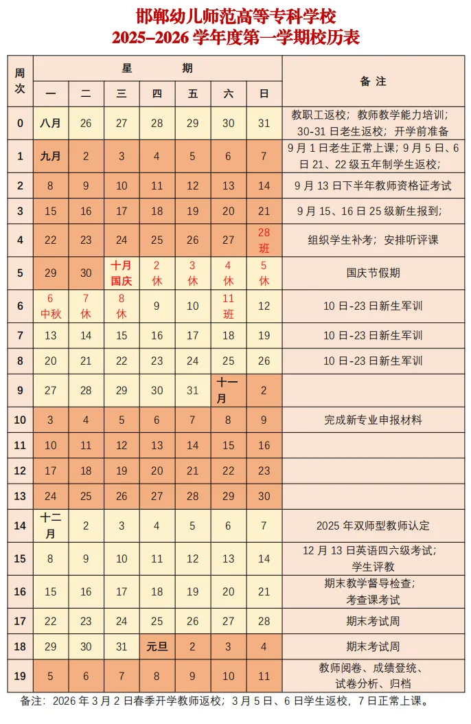 邯郸幼儿师范高等专科学校2025-2026第一学期校历