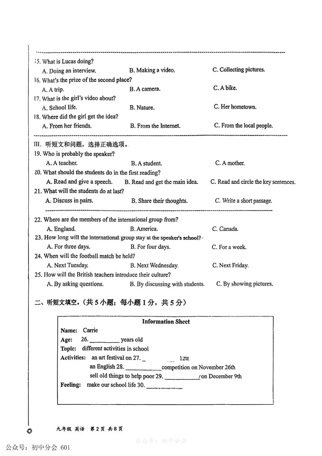 2025-2026学年九年级上学期期末模拟试卷(全科含听力)