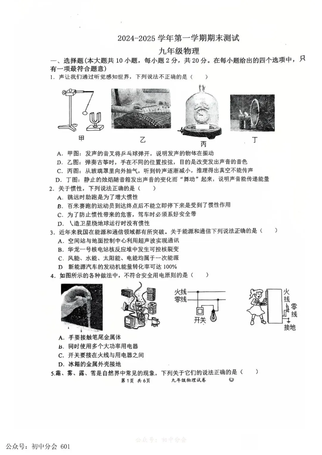 期末试卷|石家庄市长安区2025年1月九年级上学期物理期末试卷