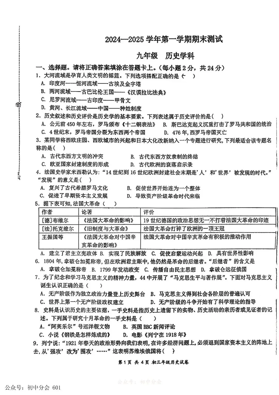 2025.1保定莲池区九年级上学期期末试题及答案(全科)
