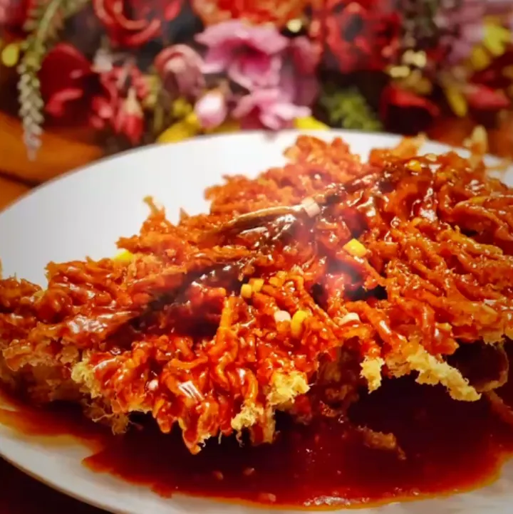 这道菜制作极为考究:需选3到3.5斤鲜鲤鱼,处理鱼头后斜切鱼体中部至鳃部,两面各切6到7片,再剪成200多根细丝。用鸡蛋、团粉、面粉调糊裹鱼,温油炸定型后细丝散开,再大火炸金黄装盘。鱼丝炸制后如金毛乍起,金黄透亮挂着橘红色番茄酱汁,鱼肉酥软鲜嫩、酸甜可口。