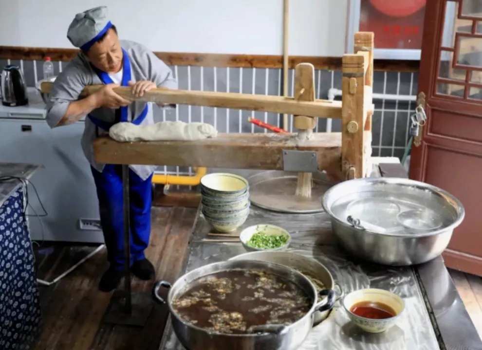 面条根根劲道分明不断条,碗底铺绿豆芽,浇上羊油辣椒、老锅汤和羊肉,撒蒜泥和香菜末。在无极当地,吃饸饹不仅仅是为了饱腹,还有着丰富的文化含义——婚礼前一天、农历二月二、除夕都有吃饸饹的传统。