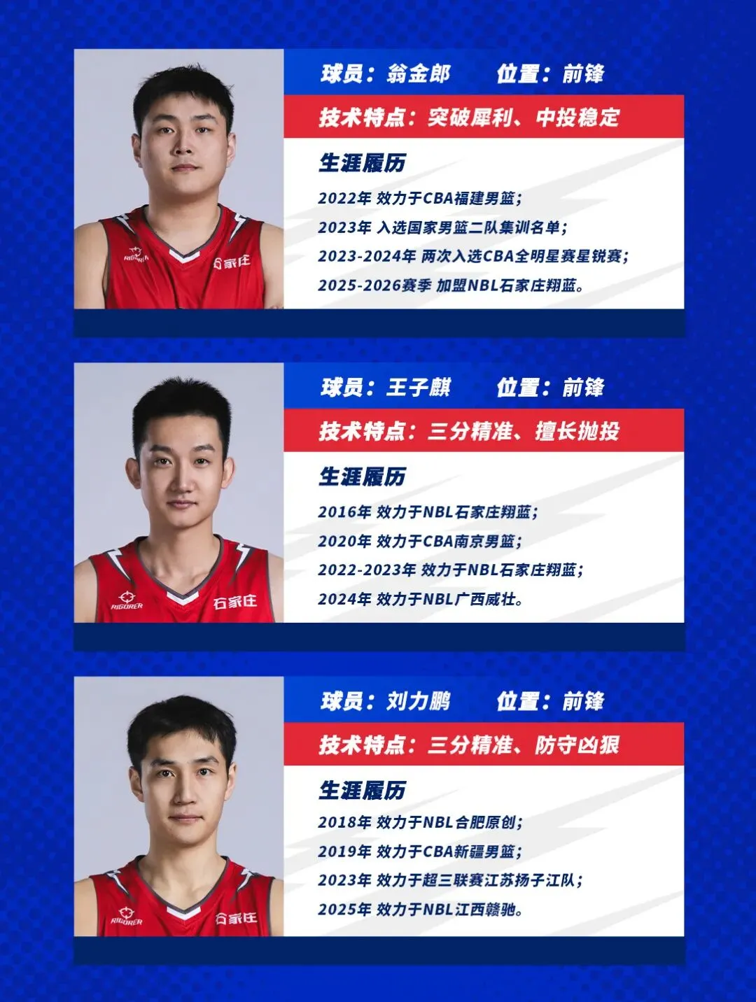 石家庄翔蓝职业篮球俱乐部,成立于2015年12月,多次获得前四名的佳绩。队中翁金郎曾效力于CBA福建队,青年队时期与林葳和曾凌铉并称“福建三少”,如今征战NBL赛场,场均16.9分、1.8次抢断并能命中3记三分球,三项数据均列于国内球员榜首,是石家庄翔蓝对内头号“国产小钢炮”。付永康毕业于中南大学,通过选秀进入CBA宁波队,本赛季场均也能拿下9.3分,前9轮比赛已有5次得分上双的表现。科伦纽克是一名来自乌克兰的大中锋,场均能砍下18.5分12.8个篮板,斯塔克斯场均20.9分4.9篮板3.3助攻表现全能,拉蒙特场均能拿下11分,新外援杰克是一名身高206的内线,暂未登场。“重点盯防对象”