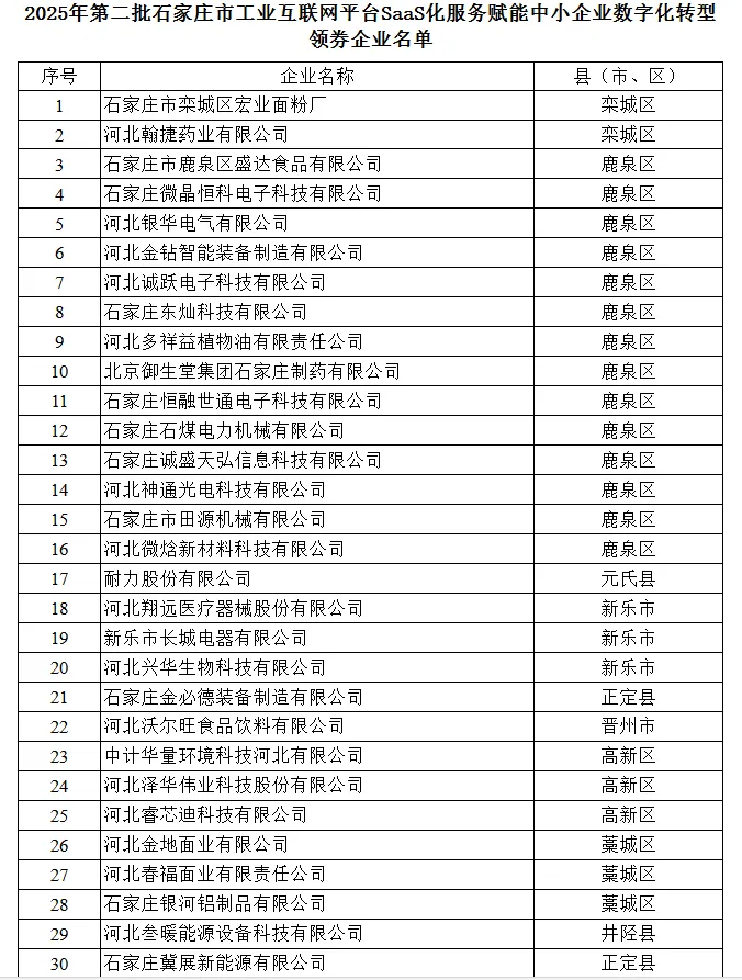 石家庄市工业和信息化局关于2025年第二批石家庄市工业互联网平台SaaS化服务赋能试点中小企业数字化转型领券企业名单公示