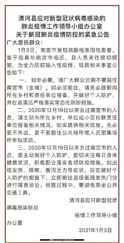 1月3日,南宫市发现核酸检测阳性患者。鉴于我县与南宫市临近,且人员来往密切频繁,为全力防控输入性疫情,现就相关事宜公告如下。