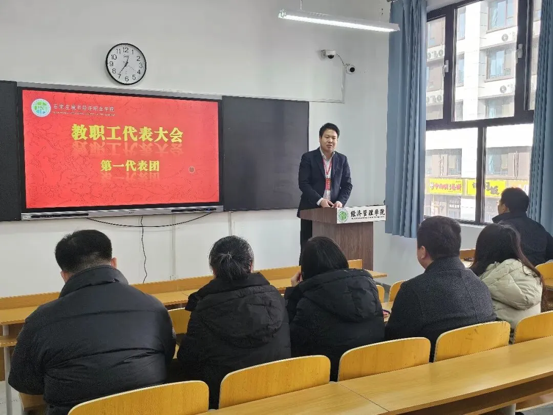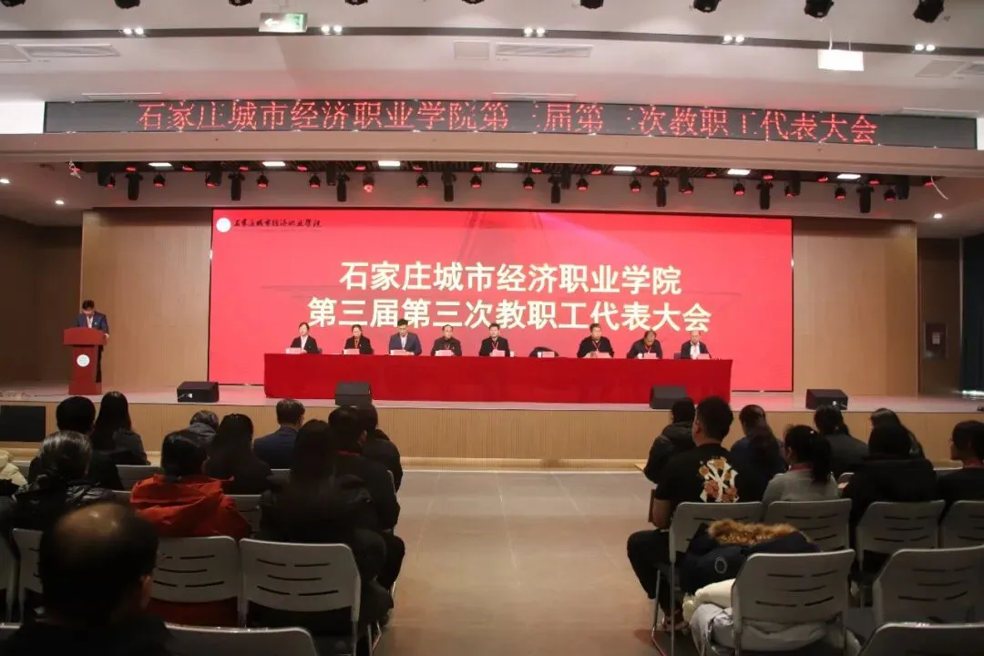 2026年1月15日,石家庄城市经济职业学院第三届第三次教职工代表大会在学术报告厅开幕。学校党委书记任明强,校长张雷,执行校长嵇建珍,执行董事、副校长和小卫,副校长郑向深、李福清出席,46名正式代表参加会议,9个部门负责人列席会议。大会由学校党委副书记、校长张雷主持。