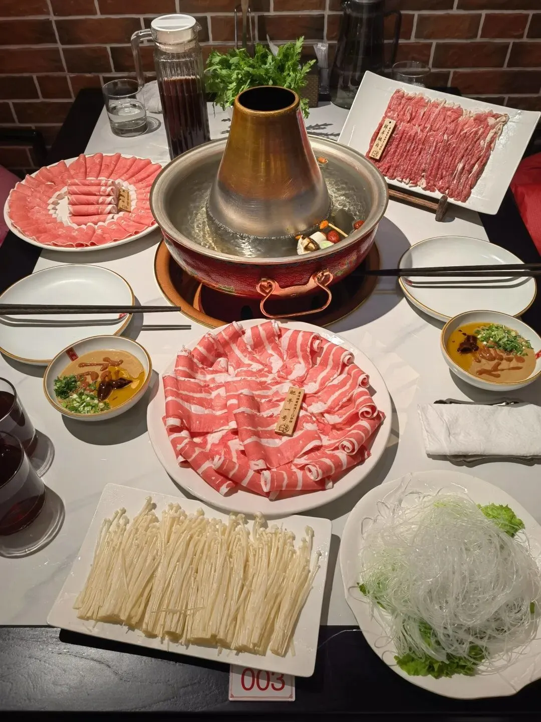 铜锅涮肉看炭火,雪花肥牛一涮三秒,芝麻酱里放韭花和腐乳,蘸厚一点才过瘾。