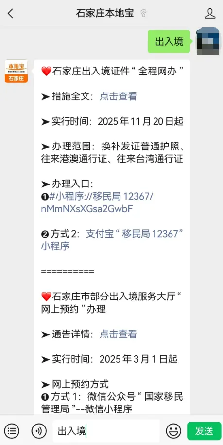 👉推荐服务:扫描或长按识别下方二维码,关注【石家庄本地宝】公众号,把菜单栏切换成对话框,在底部对话框回复【出入境】,即可获取出入境证件全程网办指南及办理入口。