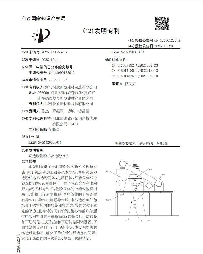 目前,铸造砂选粉机中,部分设备通过上下组合的选砂机构与选粉机构,利用转笼等结构实现砂粉分离,虽能一定程度提升设备利用率,但该类设备多针对常规机制砂的粒径范围设计,无法适配铸造砂特定的有效粒径需求,难以实现铸造砂所需的粗砂、中砂与细砂的精准三级分级。