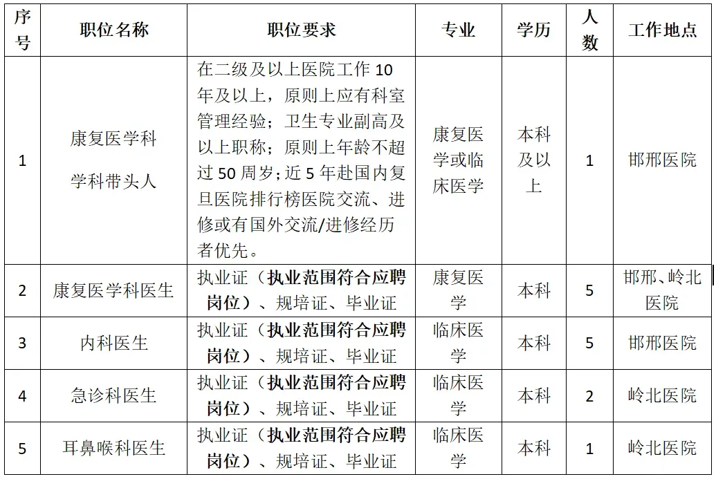 为满足医院学科发展需要,招聘医生岗位如下: