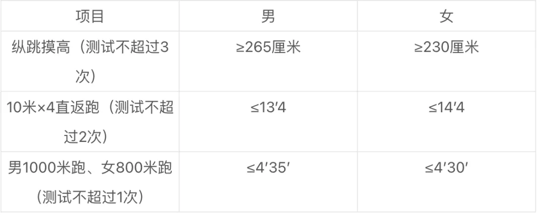 3、体能测试参照标准(可因地域、天气等情况适当调整):