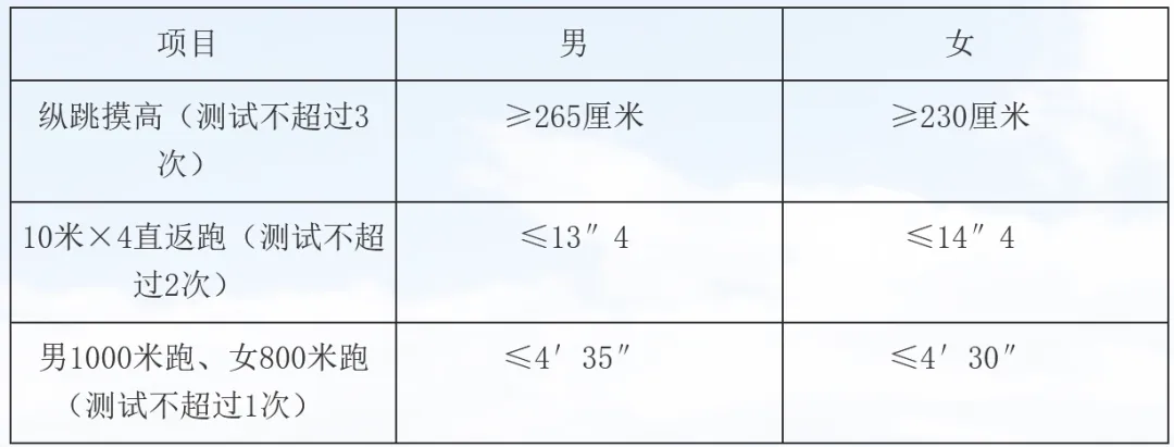 3、体能测试参照标准(可因地域、天气等情况适当调整):