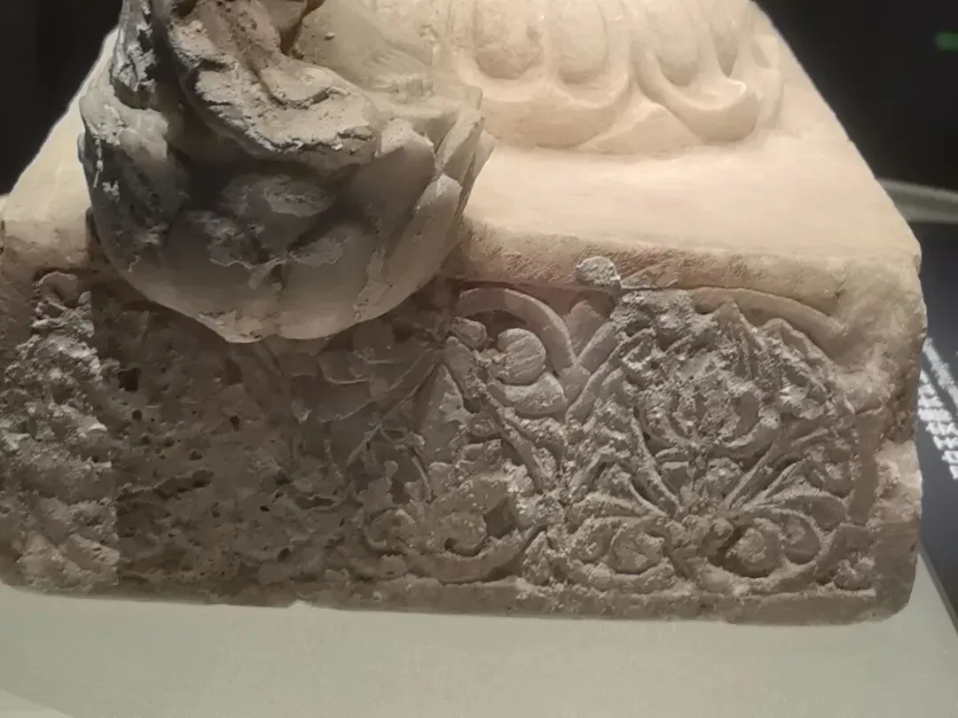 背屏和底座中间有忍冬纹和莲花的组合,保存完整,非常精美。