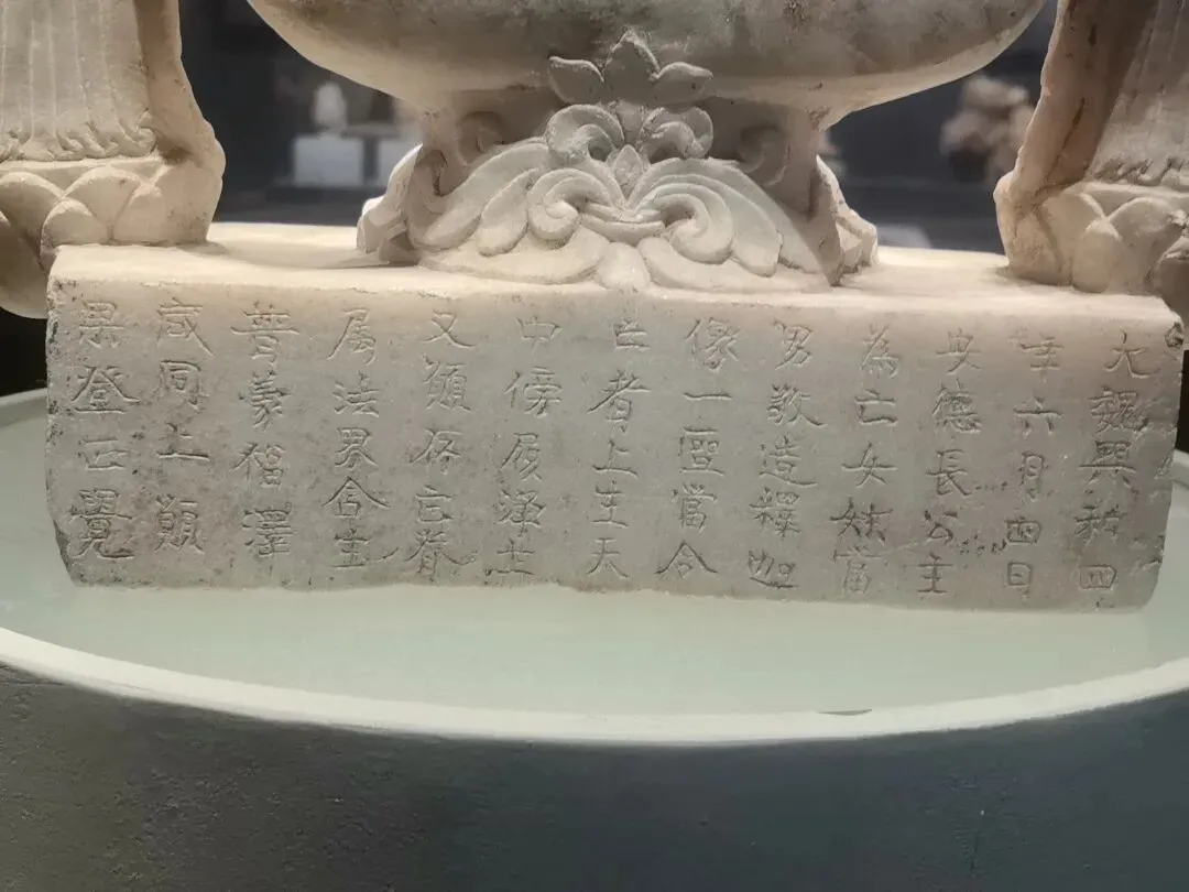 下面的底座有供养人题记:大魏兴和四年六月四日,安德长公主为亡女妹当男敬造释迦像一区,当令亡者上主天中,傍履净土,又愿存己眷属法界含生,普蒙福泽,咸同上愿,果登正觉。注明了这尊造像造于大魏兴和四年(公元542年)六月四日,安德长公主造此像一是为了超度亡女妹当男,希望其能升入天中、往生净土;二是祈愿自己现世的眷属以及法界一切众生都能蒙受福泽,最终都能证得正觉,成就佛果。