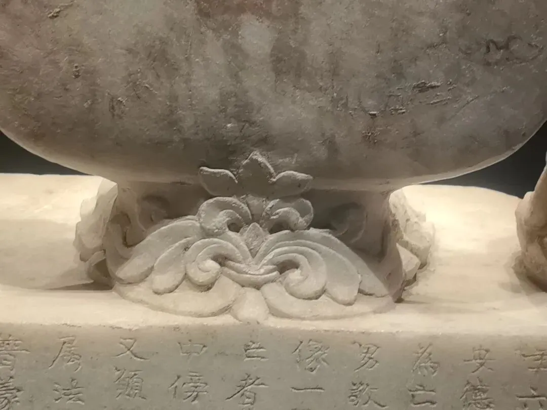 下面的底座正面和左右两个面均为浅浮雕的忍冬纹和荷叶、荷花的繁缛的组合及变形体。没有双狮香炉组合,也许粉本不同。