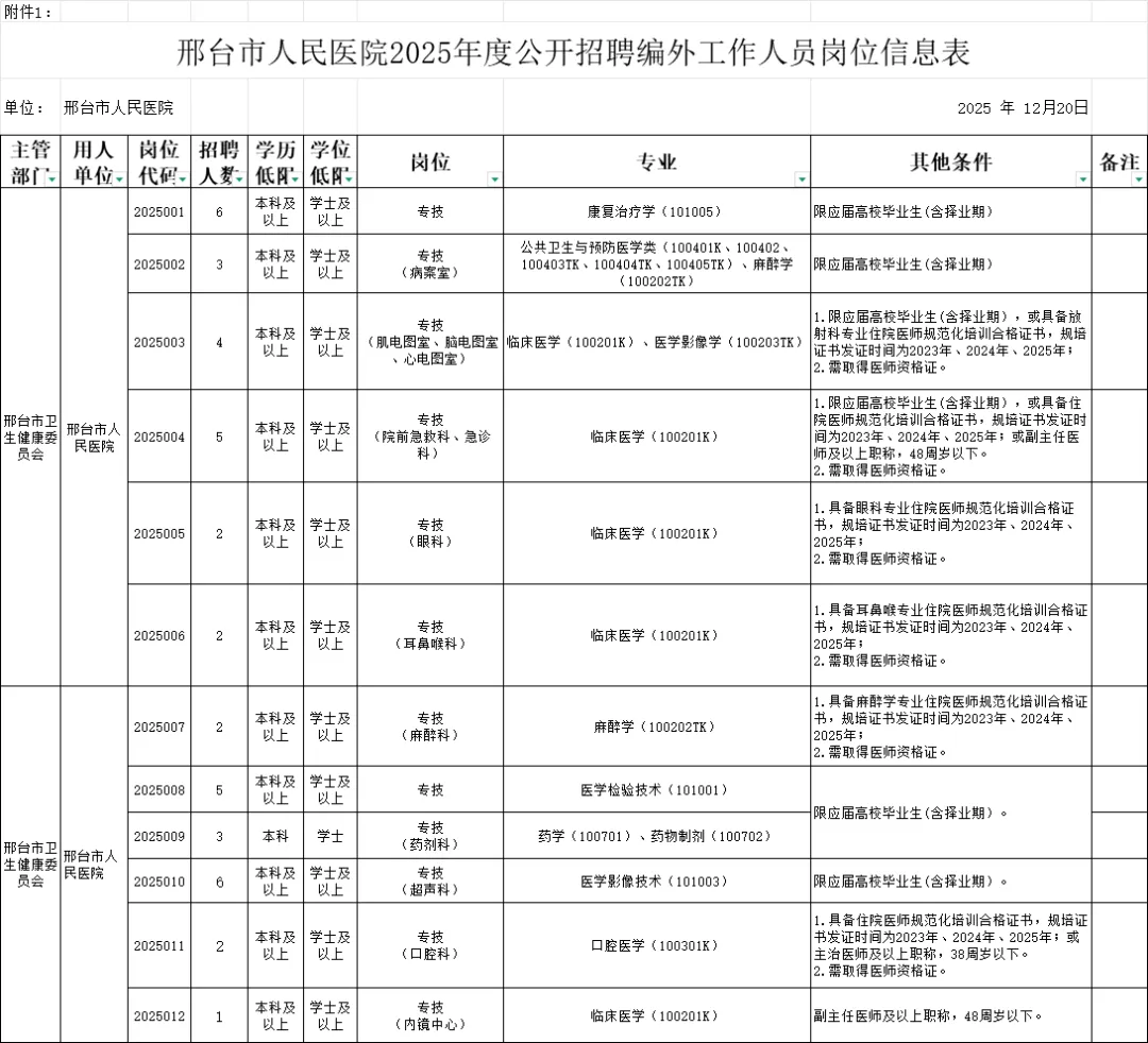 1.具体招聘人数和岗位条件详见《邢台市人民医院2025年度公开招聘编外工作人员岗位信息表》,其中专业参考教育部《研究生教育学科专业目录》《普通高等学校本科专业目录》以及中国研究生招生信息网等。