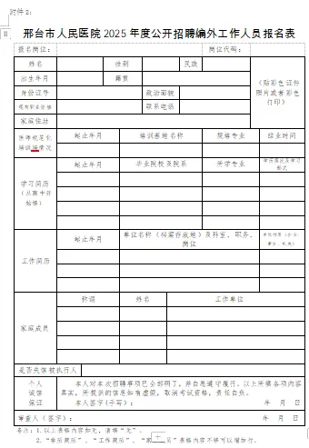 1.报名方法及确认:采用邮箱报名与现场确认相结合的方式。考生登录邢台市人民医院网站,下载并填写《邢台市人民医院2025年度公开招聘编外工作人员报名表》(附件2)。将报名登记表和其他材料电子版及扫描件,以一个压缩包的形式发送至邮箱(hosphr621@163.com),邮件主题和压缩包需以“姓名+毕业院校+所学专业+学历”命名,并在报名截止日期之前到邢台市人民医院北院区门诊五层进行现场确认及资格初审。也可以携带相关材料直接到现场报名、确认及资格初审。未在规定时间内现场确认并资格初审的视为报名不成功。
