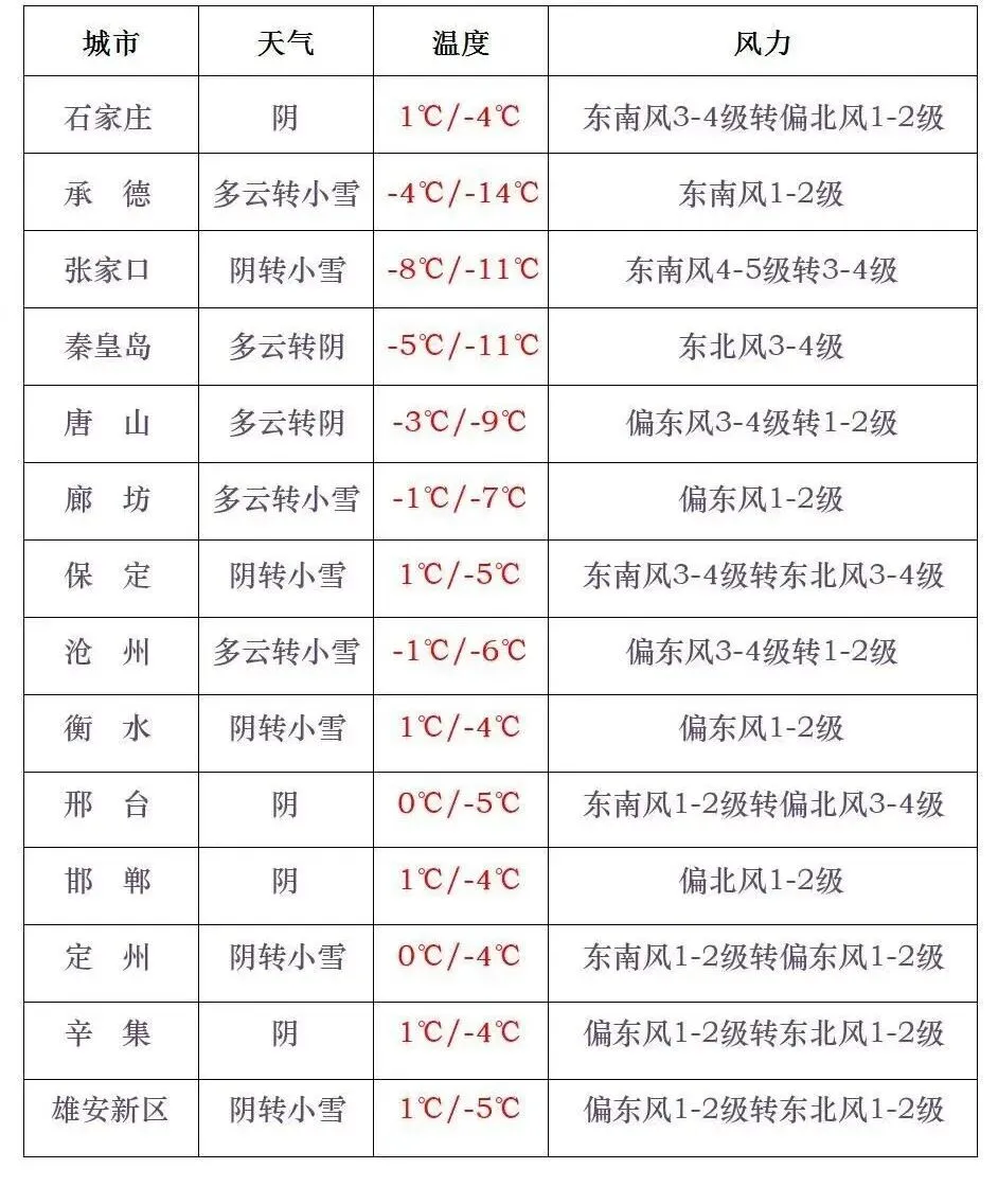 今天夜间到18日,全省多云转阴,大部分地区有小雪或零星小雪,其中沧州东部有中雪。