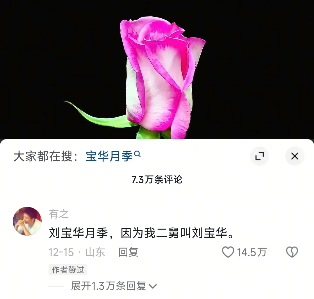 前不久,云南省农科院为新品种月季4379-4征名,山东的康先生“灵光一闪”,发了个有趣又温暖的建议:“刘宝华月季,因为我二舅叫刘宝华。”