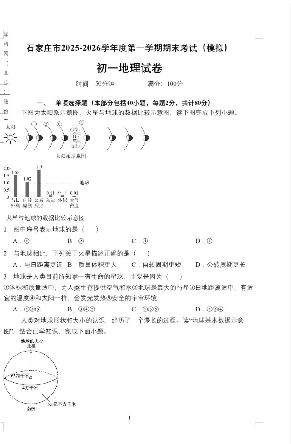 石家庄市2025-2026学年度七年级地理第一学期期末考(模拟)试卷