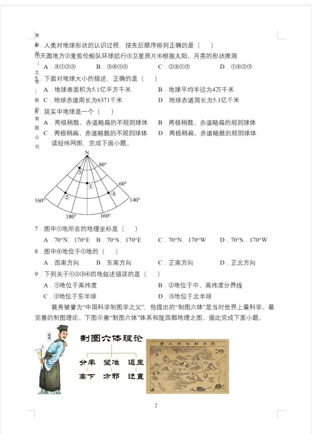 1. 地球的形状与大小:地球是两极稍扁、赤道略鼓的不规则球体;表面积5.1亿平方千米,平均半径6371千米,赤道周长约4万千米。