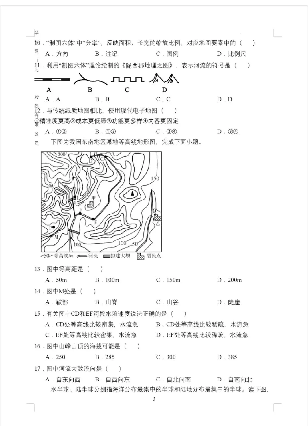 4. 等高线地形图判读:等高距、山顶/山谷/山脊/陡崖/鞍部的等高线特征;河流流向与等高线凸出方向相反;等高线越密集,坡度越陡。