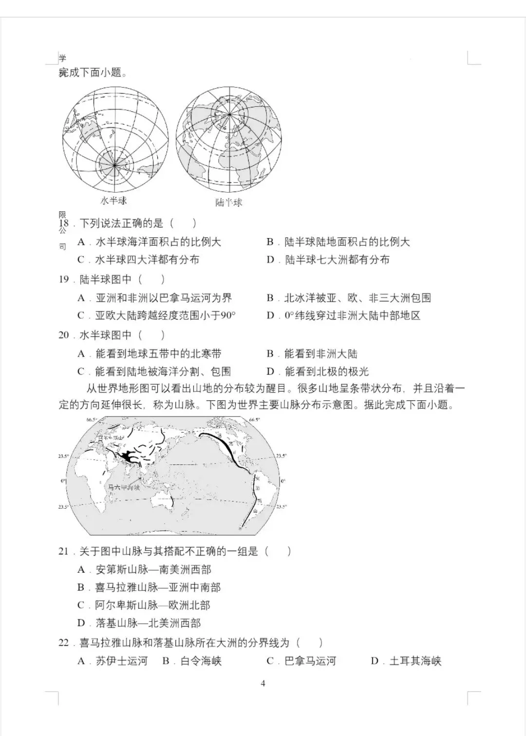 水半球是海洋分布最集中的半球,因此海洋面积占比大,A正确。陆半球是陆地分布最集中的半球,但陆地面积占比仍不足一半,并非占比大,B错误。水半球主要以太平洋、印度洋、大西洋为主,没有北冰洋,C错误。陆半球缺少南极洲等大洲,D错误。故选A。