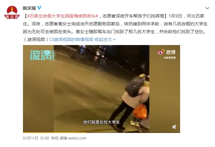 1月10日,一段石家庄放假大学生因为疫情流落街头的视频登上微博热搜。据报道,有志愿者深夜回家时,在街头遇到几名大学生,这些学生因打不到车无法回家,学校也不收留,无处可去被困街头。在确认学生核酸检测结果没问题后,志愿者为其安排住处。