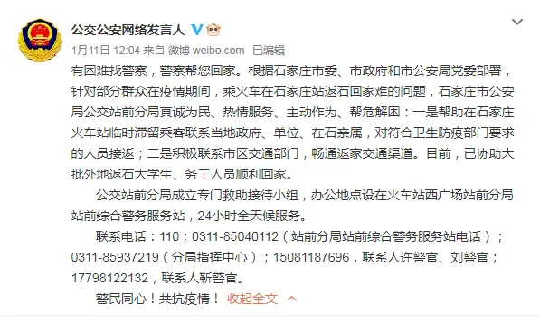 1月11日,石家庄市公安局公交站前公交分局也发布消息,已成立专门救助接待小组,协助外地返石大学生、务工人员回家。据河北日报,至12日下午,警方已帮助200多人回家。
