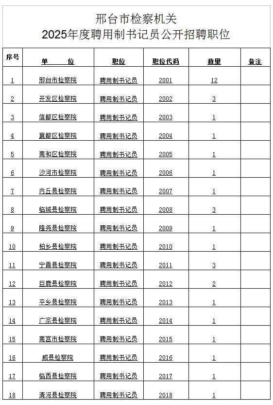 为打造一支素质优良、作风扎实、充满活力的聘用制书记员队伍,更好辅助和服务司法办案工作,根据最高法、最高检、财政部、人社部印发的《人民法院、人民检察院聘用制书记员管理制度改革方案》和省法院、省检察院、省财政厅、省人社厅印发的《河北省法院、检察院聘用制书记员管理办法(试行)》等规定,为邢台市检察机关面向社会公开招聘聘用制书记员36名。现将有关事项公告如下: