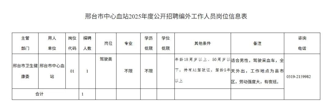 邢台市中心血站拟公开招聘工作人员1名。详见《邢台市中心血站2025年度公开招聘编外工作人员岗位信息表》。