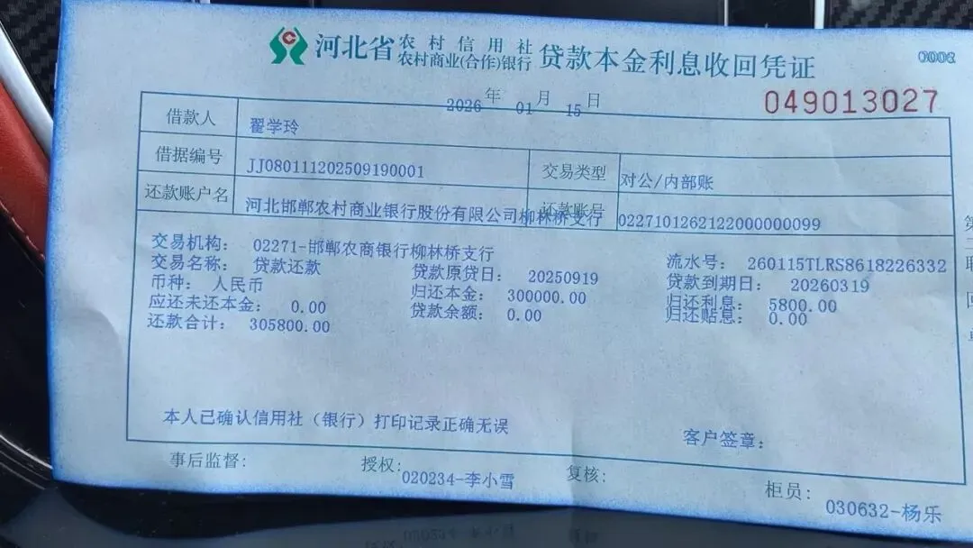 2026年1月16日,翟学玲突然接到一陌生电话,说昨天已经把30万元贷款及利息已经还给邯郸农商银行柳林桥支行了,同时也接到了一个号码为03103151339自称是邯郸农商银行的人员打来的电话,说贷款及利息已经还上了,翟学玲家属问是哪个账户还上的,是谁还的款,该银行工作人员称不显示,不知道。